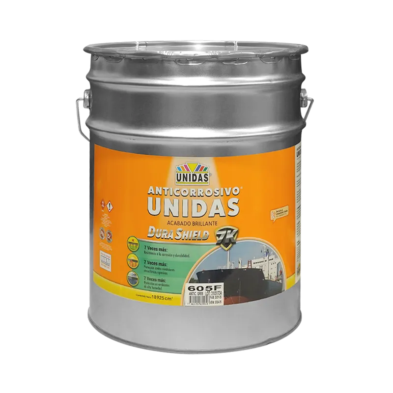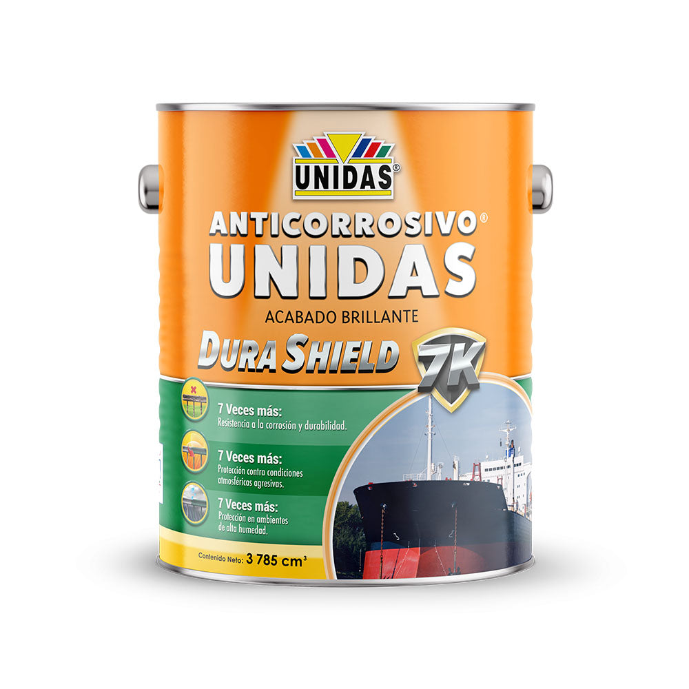 El Anticorrosivo Unidas Durashield 7K Brillante es un imprimante alquídico de alto desempeño, formulado con pigmentos inhibidores de corrosión y aditivos de última generación. Diseñado para uso en interiores y exteriores, protege eficazmente las superficies de hierro y acero expuestas a ambientes de humedad, intemperie o condiciones atmosféricas moderadamente agresivas.