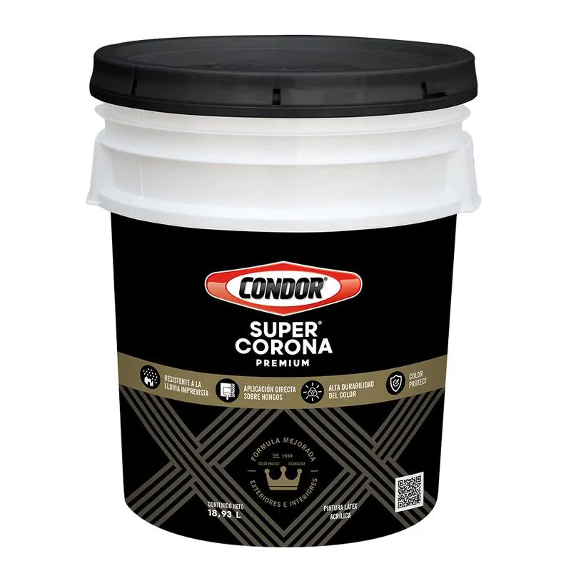 El Súper Corona® Premium es el látex acrílico de más alto nivel de Condor, especialmente formulado con polímeros acrílicos avanzados para resistir al máximo los climas agresivos de la costa, la sierra o la Amazonía. Su tecnología asegura una película protectora con alta resistencia a la intemperie, alcalinidad, hongos, algas y moho, manteniendo los colores vivos y las superficies impecables por años.