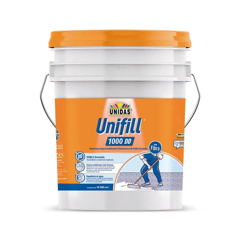 Porque el Unifill Fibra 1000 DD® está diseñado para ofrecer el doble de vida útil (hasta 10 años), con fibra sintética que refuerza y protege, asegurando que tu inversión en impermeabilización dure mucho más que con productos comunes.