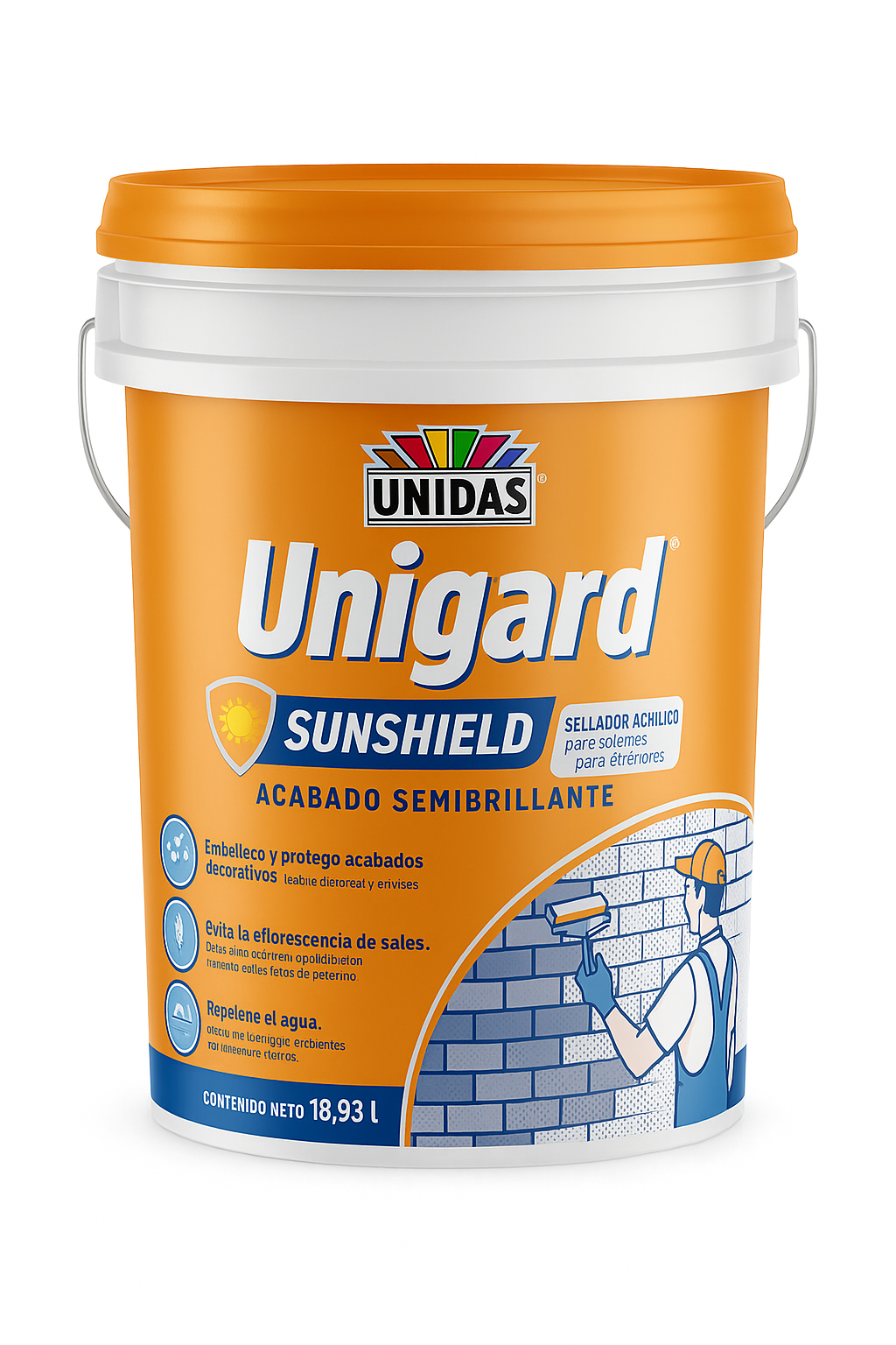 Unigard Sunshield® es un sellador acrílico premium base solvente, formulado para proteger, sellar y embellecer superficies decorativas en exteriores. Gracias a su refuerzo con filtros de protección UV y aditivos hidrorepelentes, forma una película transparente de alta durabilidad que evita la degradación por sol, humedad y eflorescencia de sales.
