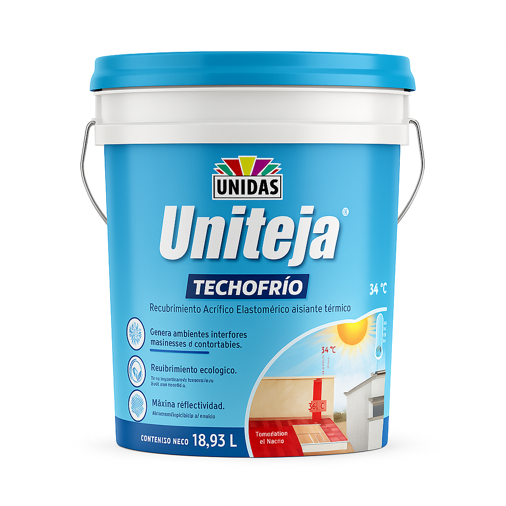 Uniteja Techofrío® es un recubrimiento acrílico elastomérico premium (látex Tipo I) diseñado para techos expuestos al sol intenso. Gracias a su avanzada formulación, combina alta reflexión solar (>90%), emisividad térmica (>0,85) y un Índice de Reflexión Solar (SRI) de 112, valores muy por encima de las pinturas convencionales.